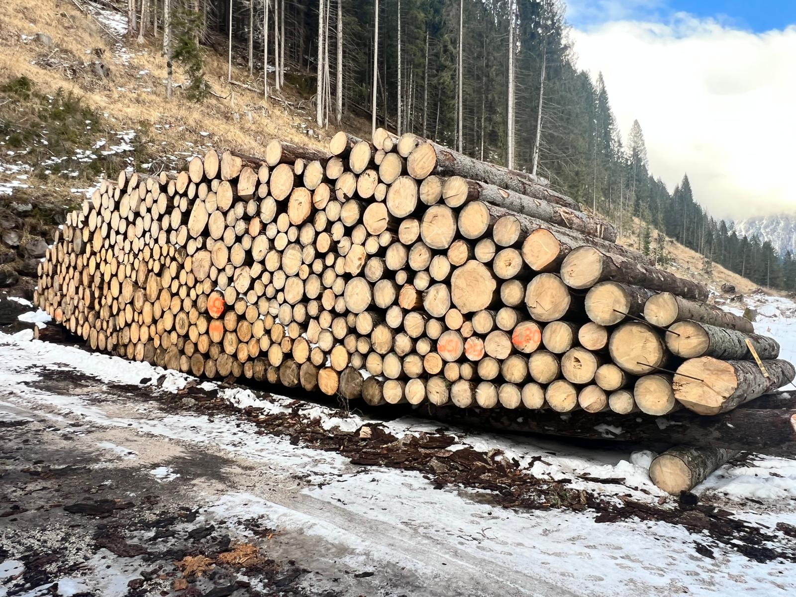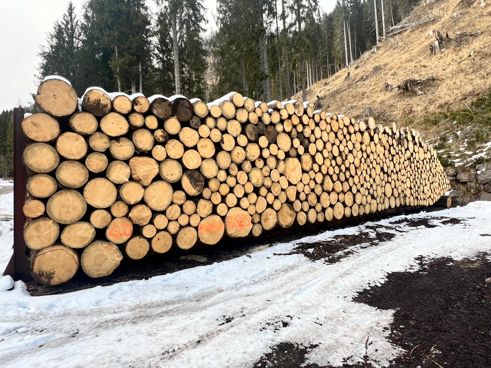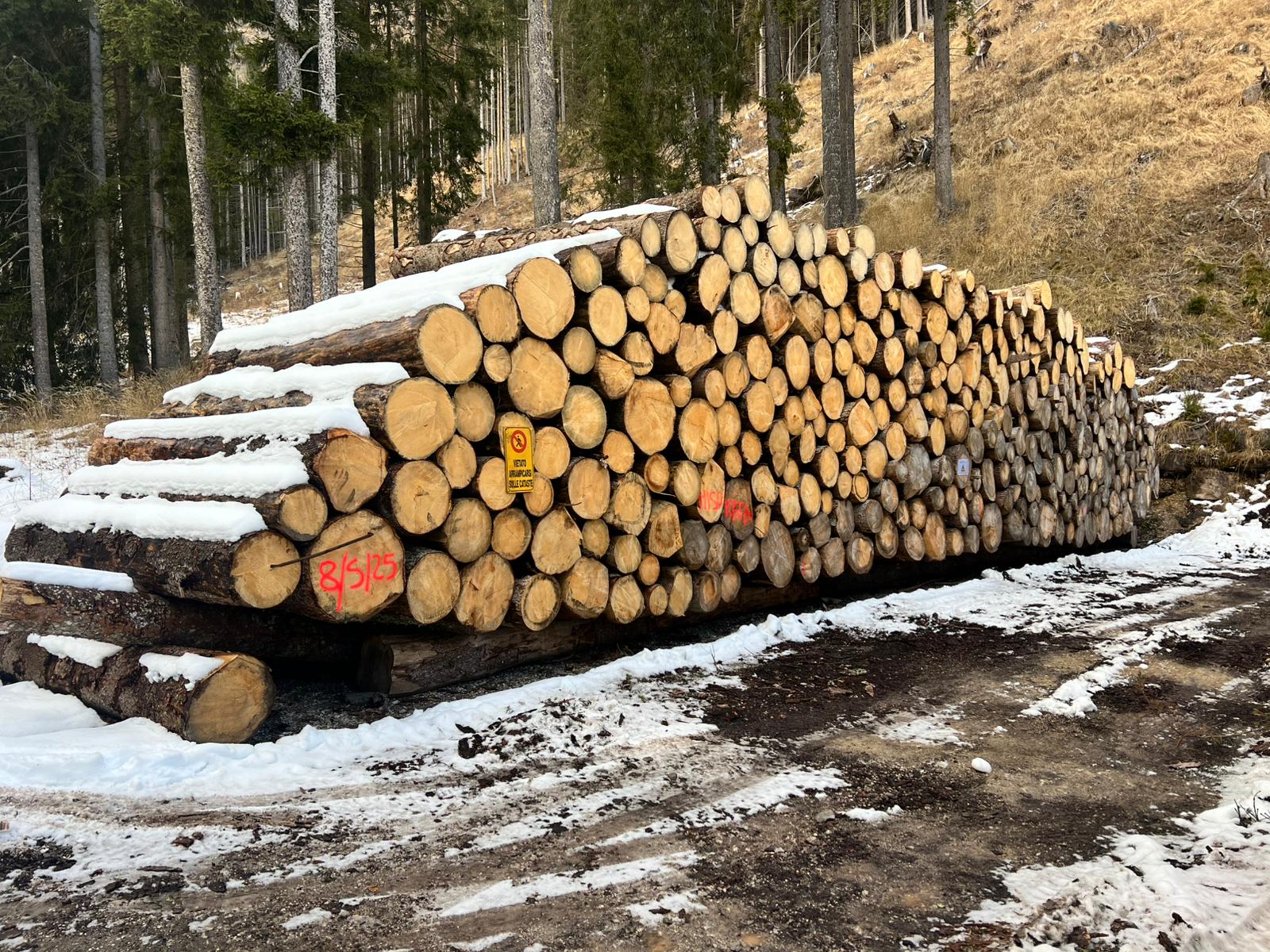 F.D. di Paneveggio. Loc. accatastamento: p.le Bocche. PINO CEMBRO di diverse lunghezze: 3, 4 e 5 m. Misurazione a cavalletto.